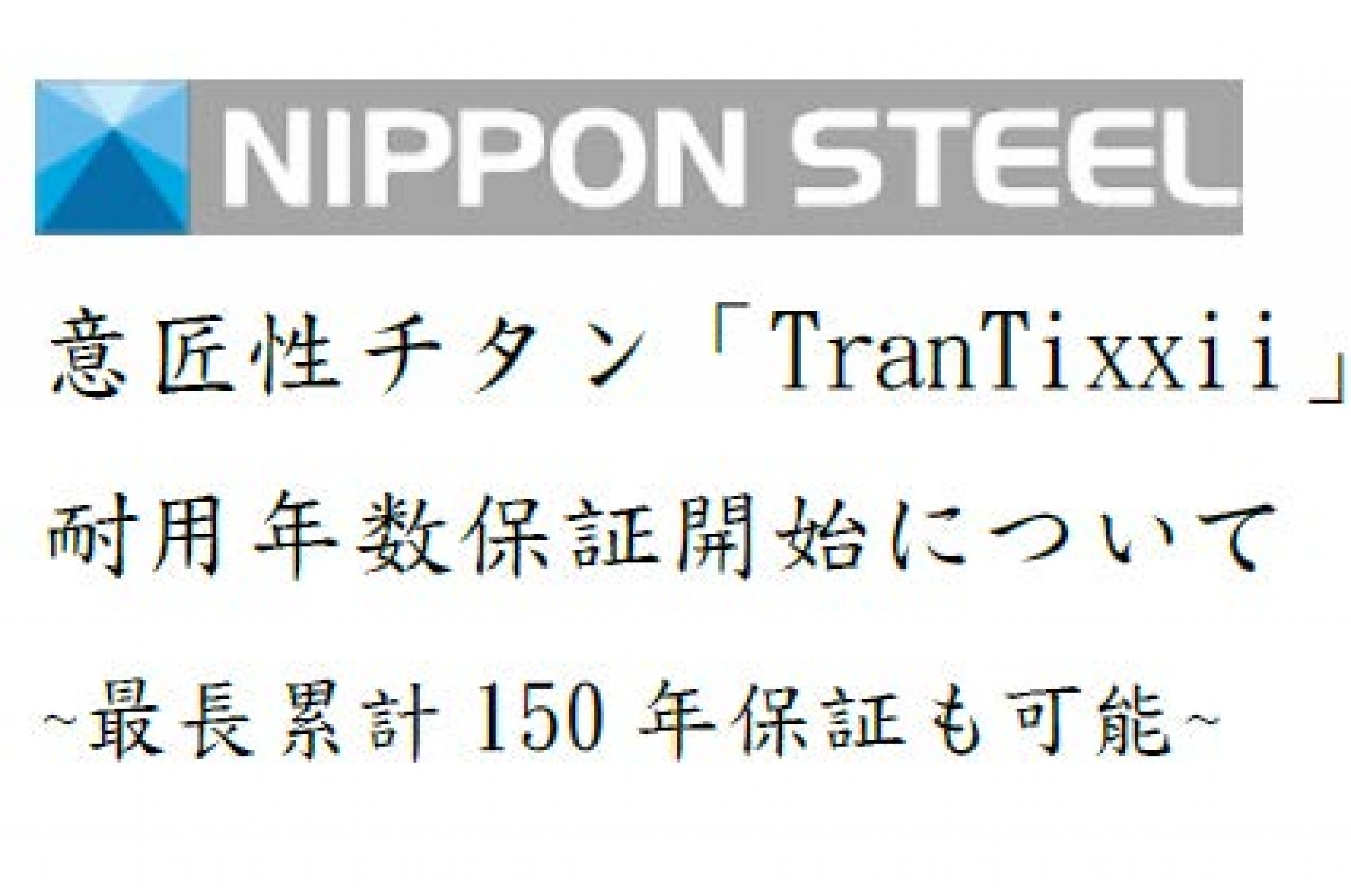 日本製鐵株式會社(以下簡稱「日本製鐵」)將自2025年1月起,針對特定類型的純鈦金屬板「TranTixxii®」及「TranTixxii® -ECO」(標準型、平坦重視型:建築裝飾用途),在符合一定條件的情況下,提供30年的耐用年數保證(以下簡稱「耐用年數保證」),該保證涵蓋因腐蝕導致的穿孔。此外,若符合特定條件,還可進行最多4次的額外延長(每次30年),使總計保證年限最長可達150年。